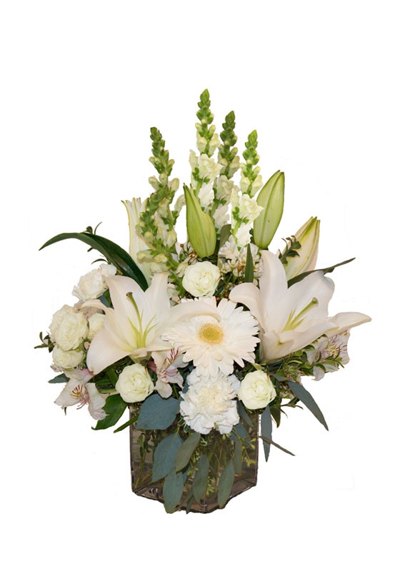 One of our most popular bouquets, the premium version of Always Sincere offers an even more stunning display of lush white blooms. This elegant bouquet is designed in a classic five-inch cube vase and features two exquisite white Oriental lilies, complemented by an abundance of long-lasting flowers. Whether placed in a home or at a service, this arrangement radiates grace, purity, and heartfelt sentiment.