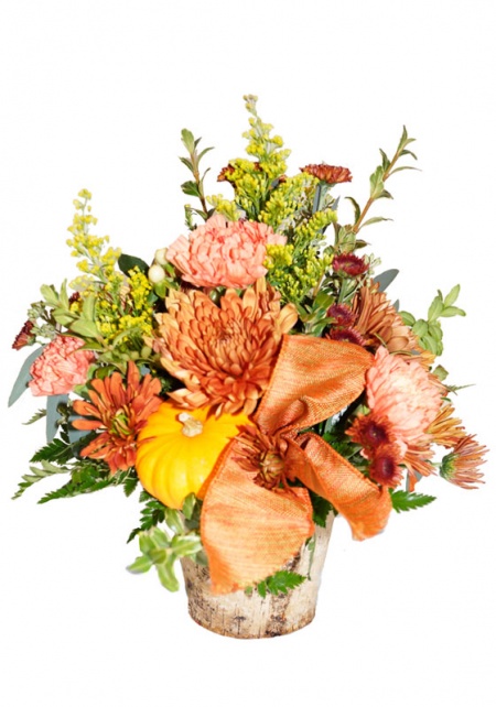 This Thanksgiving centerpiece is fixed up in a darling birch pot. This flower bouquet is filled with autumn colors and is perfect for a smaller sized table.