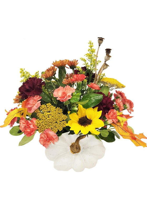 Celebrate the heart of the harvest season with our Homegrown Blessings centerpiece. Nestled in a charming white ceramic pumpkin, this all-around arrangement overflows with harvest-colored flowers, some freshly gathered from our own cutting garden.