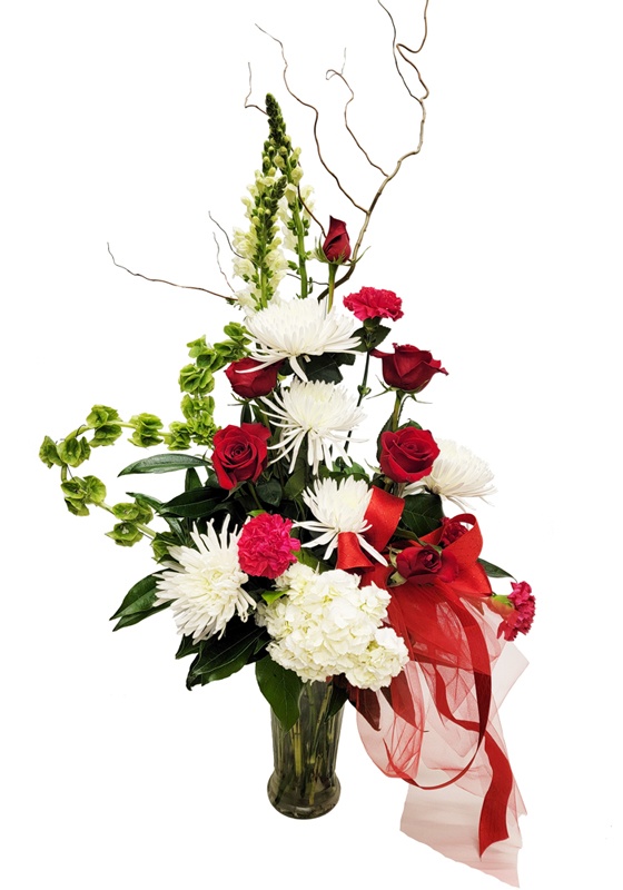 This striking Valentine’s arrangement features Bells of Ireland artfully shaped into a heart, symbolizing good fortune and lasting love. Accented with curly willow for natural movement, classic red roses, vibrant hot pink carnations, and lush white hydrangea, this design blends romance with modern artistry in a stunning glass vase. A truly unforgettable expression of love for someone who deserves something extraordinary in flowers.
