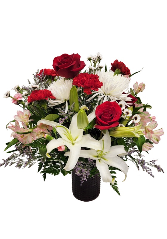 Say ‘I love you’ with this stunning Valentine’s flower design of white lilies and red roses, accented with carnations, alstroemeria, and button mums, all artfully arranged in a hobnail red vase.