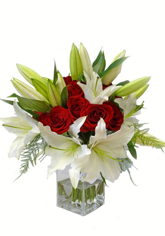 A beautiful red roses arrangement in a contemporary style. It includes fragrant white Oriental Lilies, red roses with soft, wispy plumosa fern.