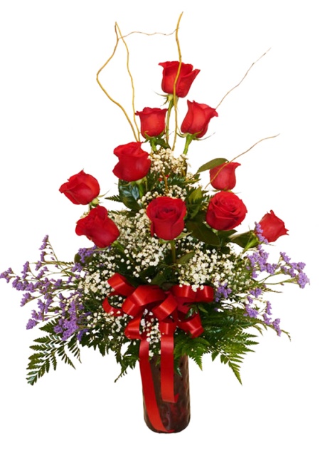 A dozen long-stemmed red roses, elegantly designed, make a breathtaking statement of love and romance. These premium red roses, each with tall, graceful stems and lush, velvety petals, are arranged in a red glass vase for a timeless presentation.